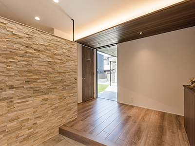 高級タイル、天井の羽目板+間接照明がアクセント。