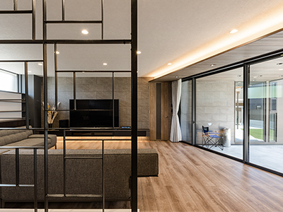 アイアンの格子がアクセントになり、空間を柔らかく仕切っている。