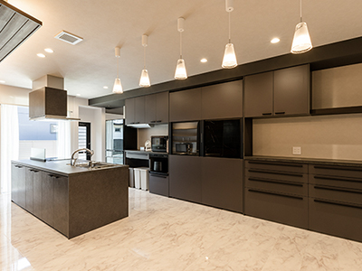 アイランドキッチンの後ろには大容量の食器棚。下げ天井をブラックの水平ラインで統一する事で空間をより広く魅せた。
