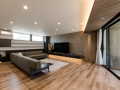 リビングとテラスが一体となるように、斜め壁に天井羽目板+間接照明が刺さっているようにデザイン。