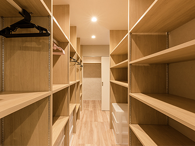 洗面パウダールームとサンルームの間に通り抜けで設置されたクロークルーム。