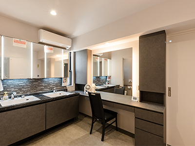 洗面ボールは2つあるので渋滞を避ける事が出来る。パウダールームも併用しているので、ゆっくりとメイクタイムを愉しむことが出来る。エアコン完備。